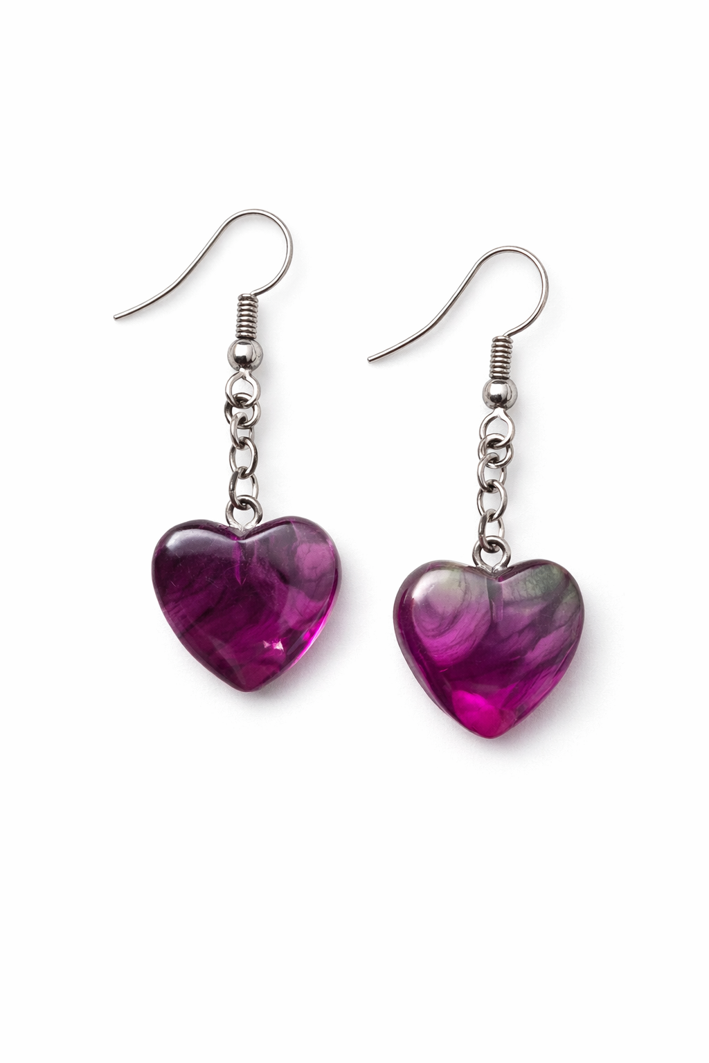 Ametist taşının mor tonlarını taşıyan kalp tasarımıyla öne çıkan bu sallantılı küpe, hem günlük kullanımda hem de özel gün kombinlerinde zarif bir tamamlayıcıdır. Minimal zincir detaylı yapısı sayesinde kulakta hafif durur, hareket ettikçe şık bir görünüm verir.