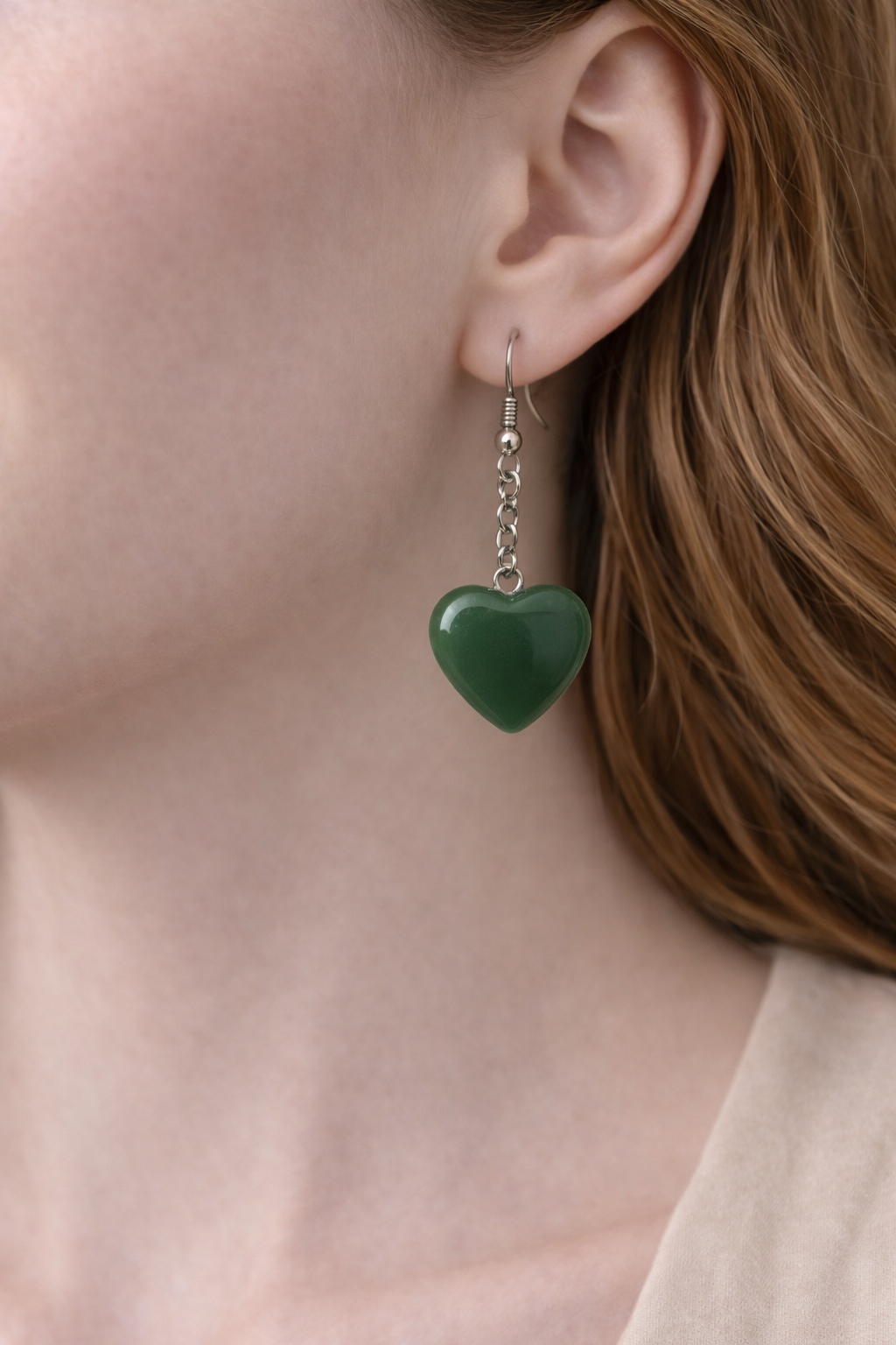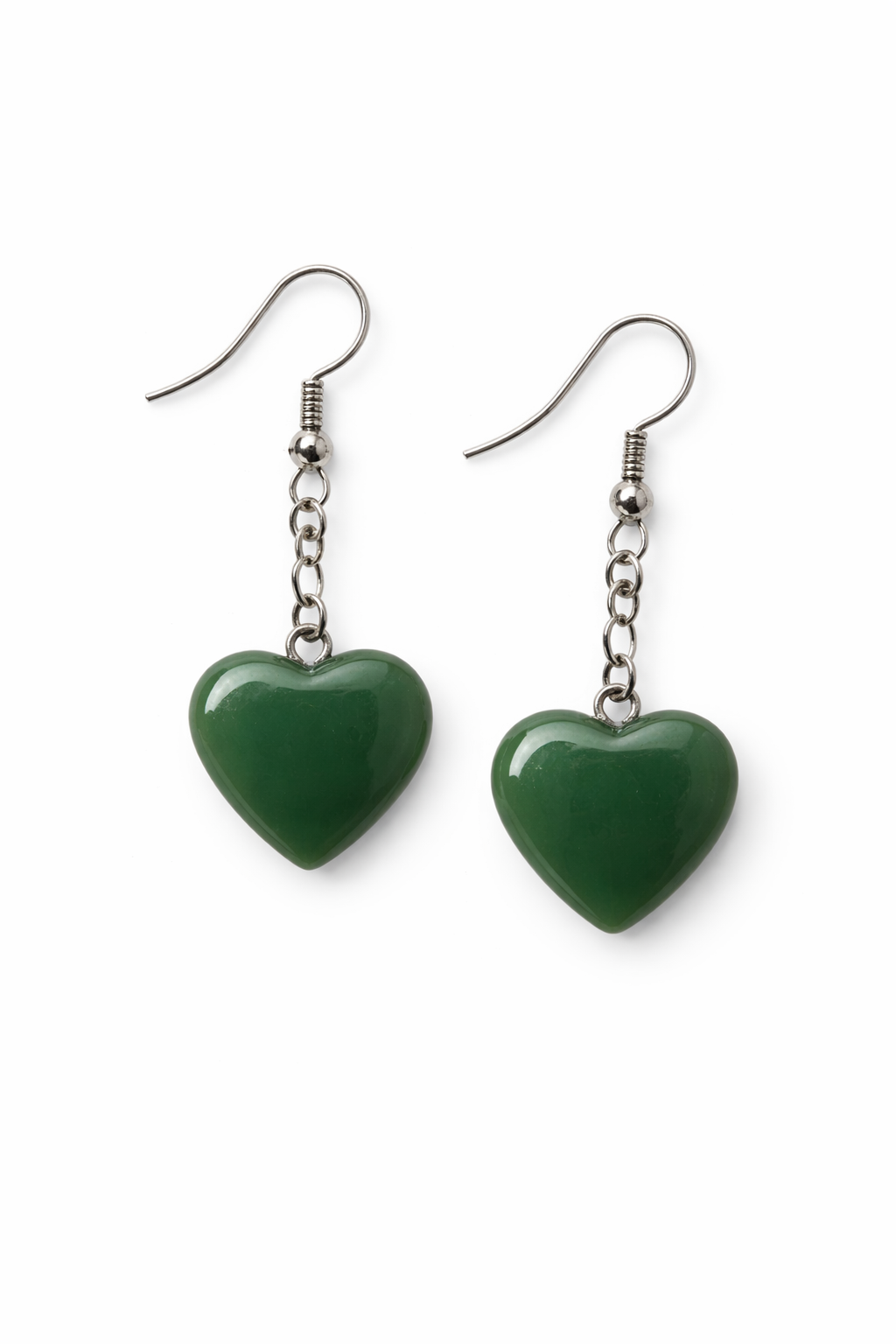 Doğal yeşim taşının zarif yeşil tonu ve kalp formu ile öne çıkan bu sallantılı küpe, hem günlük kombinlerde hem de özel günlerde şık bir tamamlayıcıdır. Her taş doğal olduğu için renk tonu ve damar yapısı üründen ürüne küçük farklılıklar gösterebilir; bu da her parçayı benzersiz kılar.
